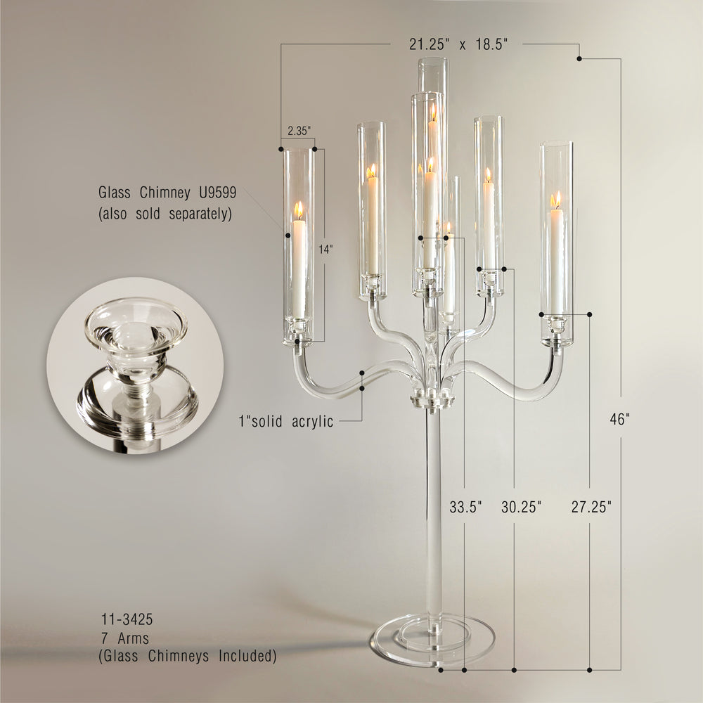 An essential statement piece for modern wedding décor, this 7-arm candelabra blends contemporary style with timeless romance. Crafted from thick, high-quality acrylic, it offers the look of crystal without the weight, making it ideal for fast-paced event setups and tear-downs. Seven elegantly curved arms each hold a protective glass chimney, ensuring steady candlelight even in larger venues or outdoor settings.