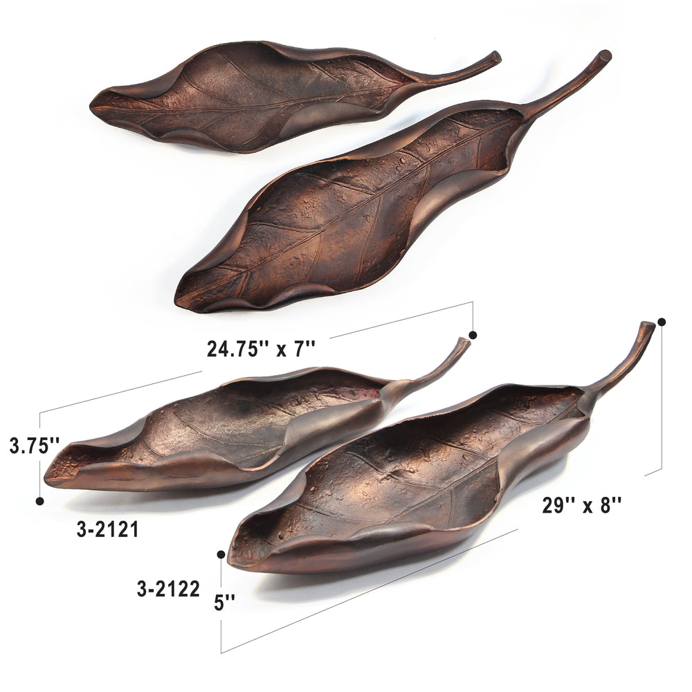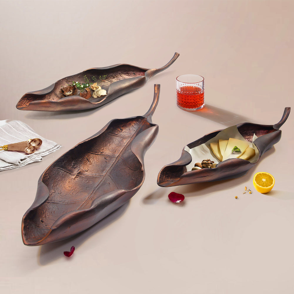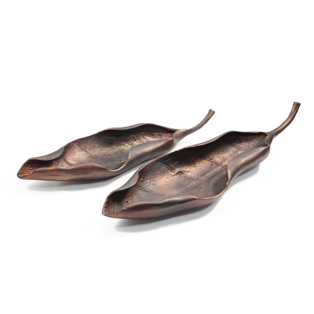 This aluminum leaf sculpture blends organic form with modern craftsmanship, creating a striking piece that functions as both art and vessel. The gently contoured leaf shape captures natural movement, while the metallic finish adds a refined, contemporary edge. Designed to hold floral arrangements or stand alone as a centerpiece, it brings texture, shine, and sculptural presence to any table or display.