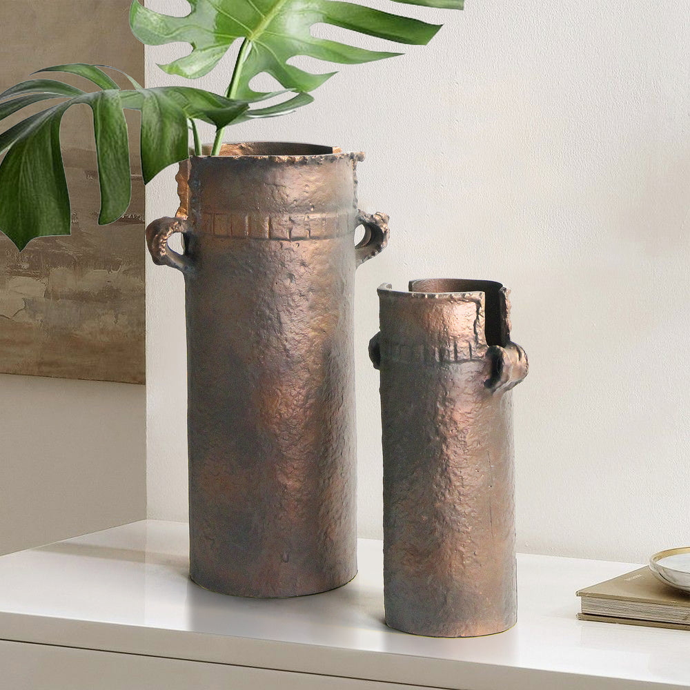 Elevate your décor with this striking cylindrical vase crafted from durable aluminum. Its sleek, modern silhouette is beautifully contrasted by a naturally weathered finish, giving each piece a unique, aged character. Perfect for fresh blooms, dried arrangements, or as a standalone decorative statement, this vase blends contemporary design with rustic charm, making it a versatile addition to any interior.