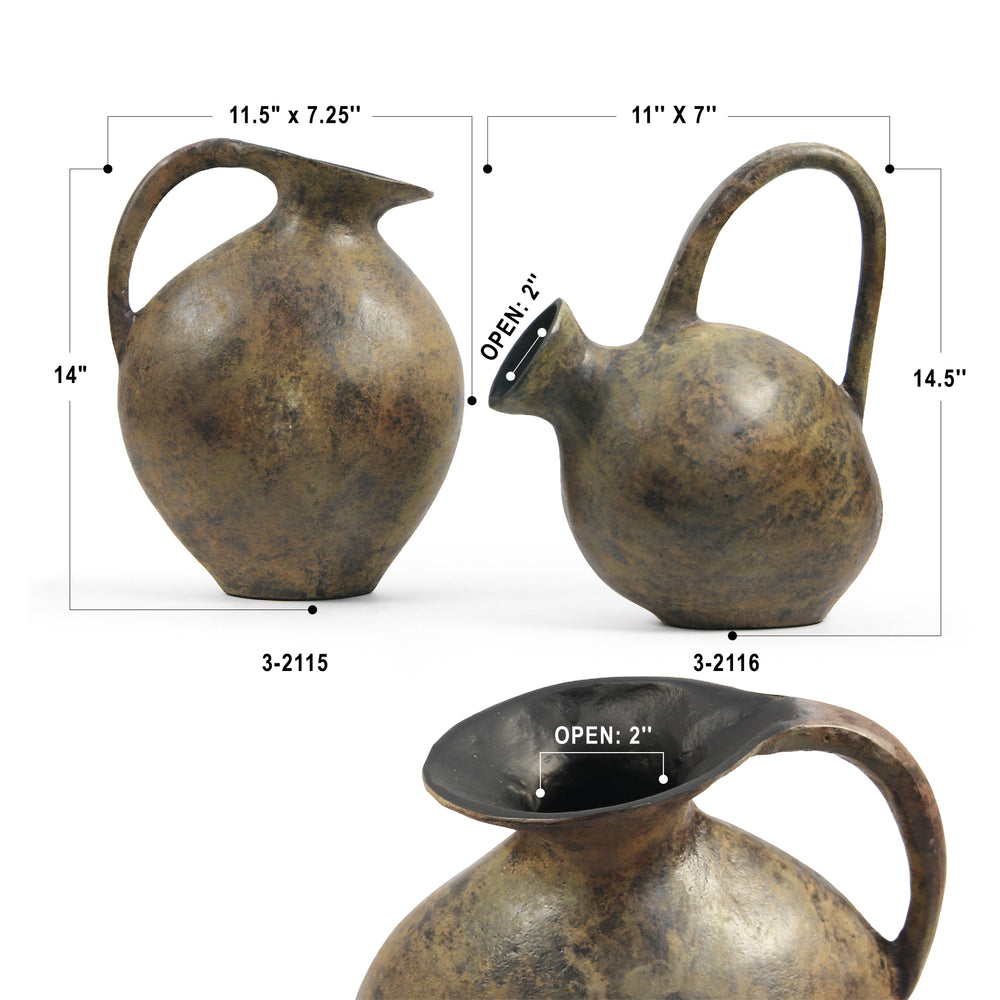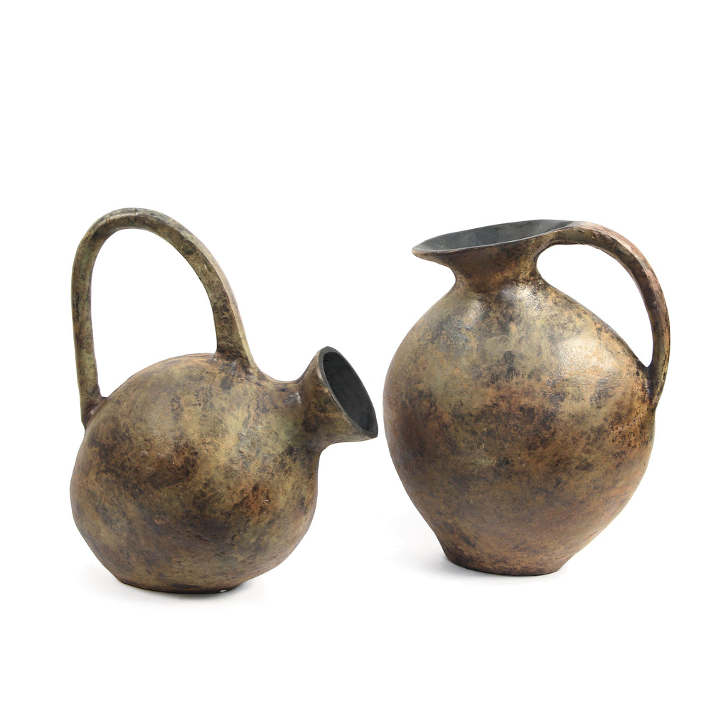 A tilted, ancient-style jar with a single side handle, rendered in aluminum to mimic the character of aged metal. Its irregular form and timeworn aesthetic recall historic vessels, reinterpreted through a modern, durable material.